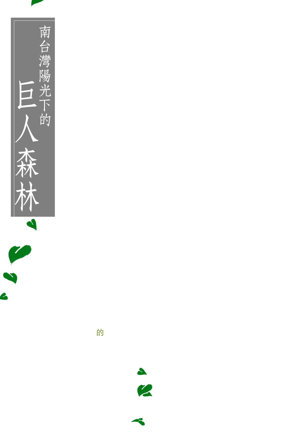 南台灣滿滿的檳榔樹,就是朱秀惠的絕活,也是巨人森林的真面目。檳榔樹當成是 有機山藥 的支架,讓藤蔓順著檳榔樹向上成長, 為了不讓藤蔓壓斷樹幹,朱秀惠花了三年時間,改良種法,日夜照顧,終於讓檳榔樹和有機山藥 和平共處, 一年下來可爬到五六層樓高的高度。走進莊園,長滿藤蔓的檳榔樹彷彿成了新的植物,像守護莊園的巨人,默默坐在不被外人打擾的森林裡,充份吸收南台灣的陽光,阿里山的泉水。使得這裡的 有機山藥 比其他地方生成的 農產 更大更多。